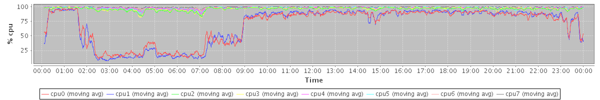 avg(cpu0) = 21.69 avg(cpu1) = 21.96 avg(cpu2) = 0.70 avg(cpu3) = 0.75 avg(cpu4) = 0.29 avg(cpu5) = 0.35 avg(cpu6) = 0.16 avg(cpu7) = 0.11