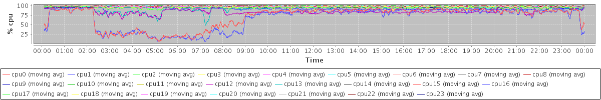 avg(cpu0) = 20.90 avg(cpu1) = 24.44 avg(cpu2) = 0.45 avg(cpu3) = 0.42 avg(cpu4) = 0.19 avg(cpu5) = 0.24 avg(cpu6) = 0.08 avg(cpu7) = 0.06 avg(cpu8) = 0.04 avg(cpu9) = 0.11 avg(cpu10) = 0.02 avg(cpu11) = 0.10 avg(cpu12) = 3.68 avg(cpu13) = 3.68 avg(cpu14) = 0.13 avg(cpu15) = 0.04 avg(cpu16) = 0.09 avg(cpu17) = 0.03 avg(cpu18) = 0.09 avg(cpu19) = 0.08 avg(cpu20) = 0.01 avg(cpu21) = 0.02 avg(cpu22) = 0.01 avg(cpu23) = 0.09