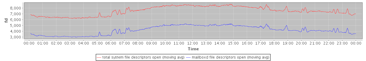 avg(total system file descriptors open) = 7515.42 avg(mailboxd file descriptors open) = 4192.84