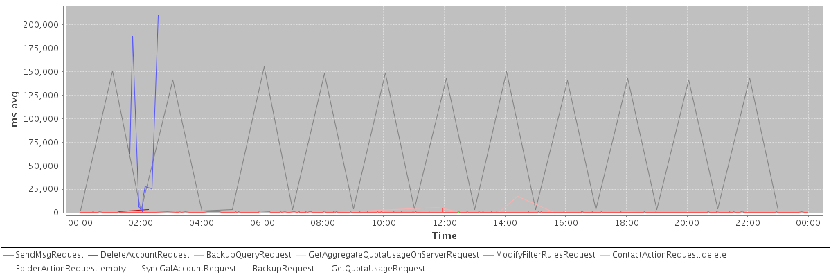 avg(SendMsgRequest) = 319.69 avg(DeleteAccountRequest) = 67059.00 avg(BackupQueryRequest) = 841.40 avg(GetAggregateQuotaUsageOnServerRequest) = 1324.00 avg(ModifyFilterRulesRequest) = 16653.00 avg(ContactActionRequest.delete) = 567.00 avg(FolderActionRequest.empty) = 2528.80 avg(SyncGalAccountRequest) = 68548.75 avg(BackupRequest) = 2173.50 avg(GetQuotaUsageRequest) = 1348.00