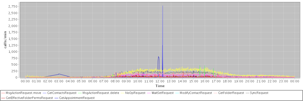 max(MsgActionRequest.move) = 248.00 max(GetContactsRequest) = 2784.00 max(MsgActionRequest.delete) = 470.00 max(NoOpRequest) = 425.00 max(WaitSetRequest) = 167.00 max(ModifyContactRequest) = 252.00 max(GetFolderRequest) = 293.00 max(SyncRequest) = 326.00 max(GetEffectiveFolderPermsRequest) = 164.00 max(GetAppointmentRequest) = 1250.00