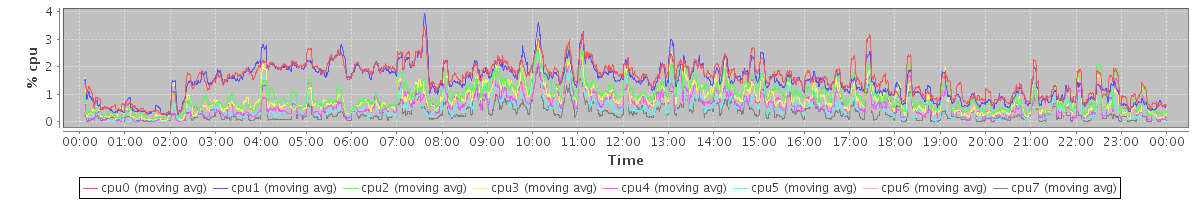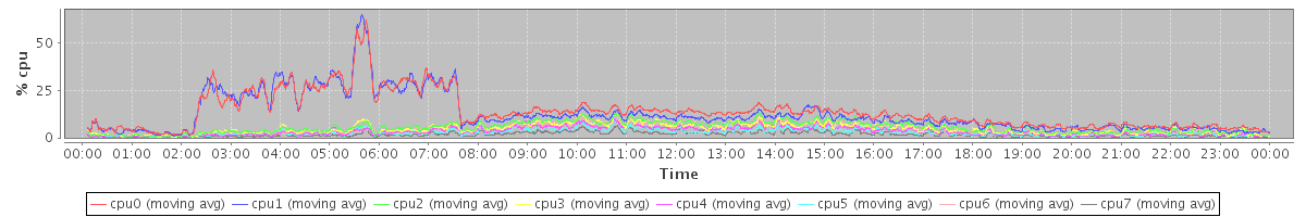avg(cpu0) = 1.54 avg(cpu1) = 1.45 avg(cpu2) = 0.93 avg(cpu3) = 0.83 avg(cpu4) = 0.62 avg(cpu5) = 0.54 avg(cpu6) = 0.60 avg(cpu7) = 0.34