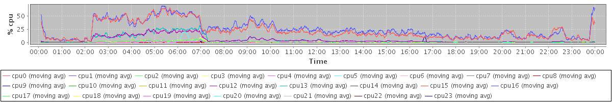 avg(cpu0) = 22.05 avg(cpu1) = 24.68 avg(cpu2) = 0.96 avg(cpu3) = 0.98 avg(cpu4) = 0.46 avg(cpu5) = 0.85 avg(cpu6) = 0.18 avg(cpu7) = 0.21 avg(cpu8) = 0.07 avg(cpu9) = 0.32 avg(cpu10) = 0.13 avg(cpu11) = 0.26 avg(cpu12) = 5.21 avg(cpu13) = 5.55 avg(cpu14) = 0.28 avg(cpu15) = 0.12 avg(cpu16) = 0.20 avg(cpu17) = 0.10 avg(cpu18) = 0.04 avg(cpu19) = 0.21 avg(cpu20) = 0.03 avg(cpu21) = 0.06 avg(cpu22) = 0.05 avg(cpu23) = 0.14