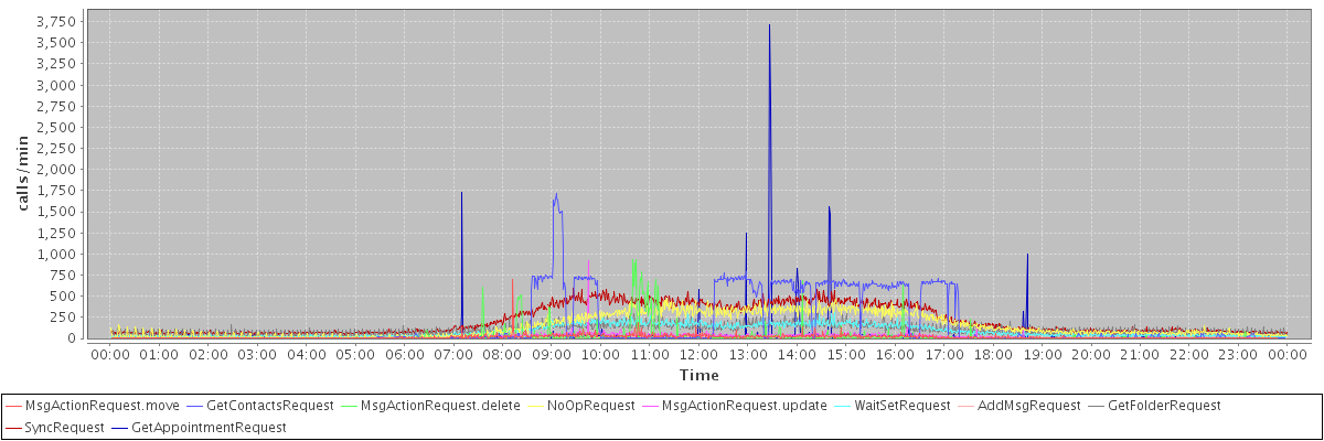 max(MsgActionRequest.move) = 703.00 max(GetContactsRequest) = 1712.00 max(MsgActionRequest.delete) = 938.00 max(NoOpRequest) = 471.00 max(MsgActionRequest.update) = 923.00 max(WaitSetRequest) = 301.00 max(AddMsgRequest) = 380.00 max(GetFolderRequest) = 309.00 max(SyncRequest) = 588.00 max(GetAppointmentRequest) = 3716.00