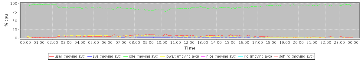 avg(user) = 5.25 avg(sys) = 0.71 avg(idle) = 89.78 avg(iowait) = 4.16 avg(nice) = 0.00 avg(irq) = 0.00 avg(softirq) = 0.10