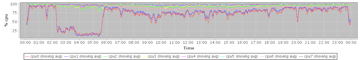 avg(cpu0) = 18.80 avg(cpu1) = 17.42 avg(cpu2) = 0.80 avg(cpu3) = 0.77 avg(cpu4) = 0.37 avg(cpu5) = 0.34 avg(cpu6) = 0.30 avg(cpu7) = 0.14