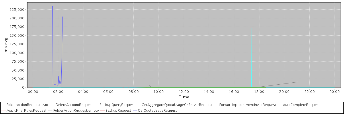 avg(FolderActionRequest.sync) = 725.00 avg(DeleteAccountRequest) = 64577.50 avg(BackupQueryRequest) = 459.33 avg(GetAggregateQuotaUsageOnServerRequest) = 1105.00 avg(ForwardAppointmentInviteRequest) = 392.00 avg(AutoCompleteRequest) = 326.90 avg(ApplyFilterRulesRequest) = 2212.50 avg(FolderActionRequest.empty) = 1851.85 avg(BackupRequest) = 1047.50 avg(GetQuotaUsageRequest) = 1207.00