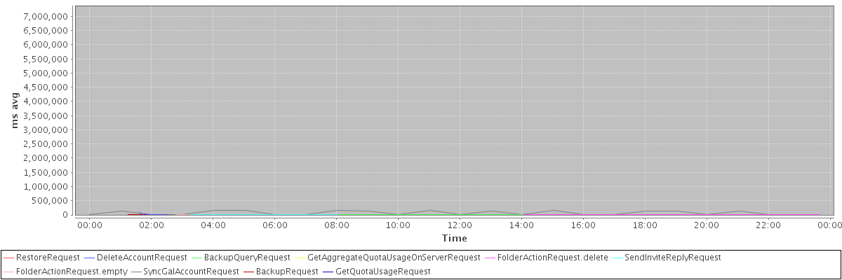 avg(RestoreRequest) = 7026494.00 avg(DeleteAccountRequest) = 22300.86 avg(BackupQueryRequest) = 694.40 avg(GetAggregateQuotaUsageOnServerRequest) = 1643.00 avg(FolderActionRequest.delete) = 560.38 avg(SendInviteReplyRequest) = 307.11 avg(FolderActionRequest.empty) = 690.25 avg(SyncGalAccountRequest) = 69819.08 avg(BackupRequest) = 2377.00 avg(GetQuotaUsageRequest) = 1692.00