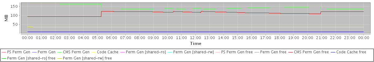 avg(PS Perm Gen) = 0.00 avg(Perm Gen) = 0.00 avg(CMS Perm Gen) = 143.91 avg(Code Cache) = 36.17 avg(Perm Gen [shared-ro]) = 0.00 avg(Perm Gen [shared-rw]) = 0.00 avg(PS Perm Gen free) = 0.00 avg(Perm Gen free) = 0.00 avg(CMS Perm Gen free) = 112.09 avg(Code Cache free) = 10.46 avg(Perm Gen [shared-ro] free) = 0.00 avg(Perm Gen [shared-rw] free) = 0.00