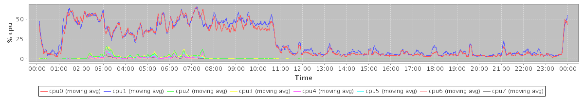 avg(cpu0) = 22.07 avg(cpu1) = 23.68 avg(cpu2) = 1.21 avg(cpu3) = 1.25 avg(cpu4) = 0.61 avg(cpu5) = 0.66 avg(cpu6) = 0.24 avg(cpu7) = 0.31