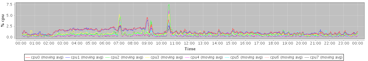 avg(cpu0) = 1.18 avg(cpu1) = 1.16 avg(cpu2) = 0.70 avg(cpu3) = 0.74 avg(cpu4) = 0.42 avg(cpu5) = 0.51 avg(cpu6) = 0.39 avg(cpu7) = 0.28