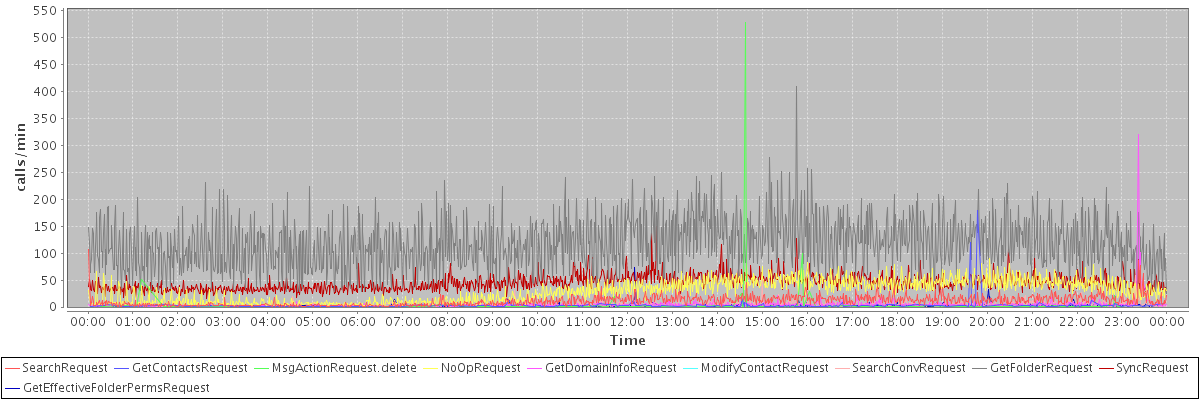 max(SearchRequest) = 107.00 max(GetContactsRequest) = 180.00 max(MsgActionRequest.delete) = 529.00 max(NoOpRequest) = 90.00 max(GetDomainInfoRequest) = 320.00 max(ModifyContactRequest) = 237.00 max(SearchConvRequest) = 59.00 max(GetFolderRequest) = 410.00 max(SyncRequest) = 149.00 max(GetEffectiveFolderPermsRequest) = 74.00