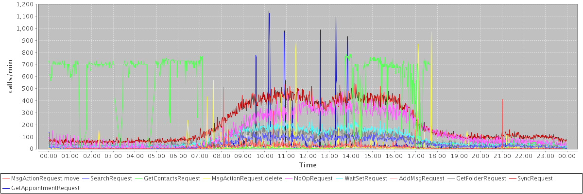 max(MsgActionRequest.move) = 512.00 max(SearchRequest) = 158.00 max(GetContactsRequest) = 787.00 max(MsgActionRequest.delete) = 973.00 max(NoOpRequest) = 479.00 max(WaitSetRequest) = 252.00 max(AddMsgRequest) = 316.00 max(GetFolderRequest) = 226.00 max(SyncRequest) = 544.00 max(GetAppointmentRequest) = 1146.00