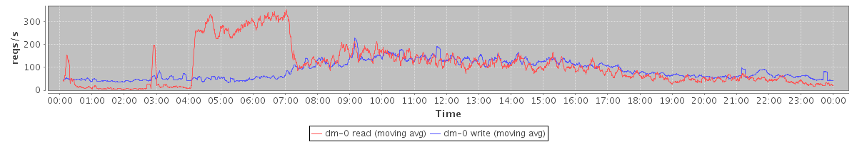 avg(dm-1 read) = 0.36 avg(dm-1 write) = 382.65