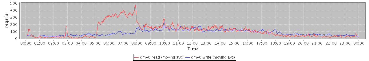 avg(dm-1 read) = 0.28 avg(dm-1 write) = 389.63