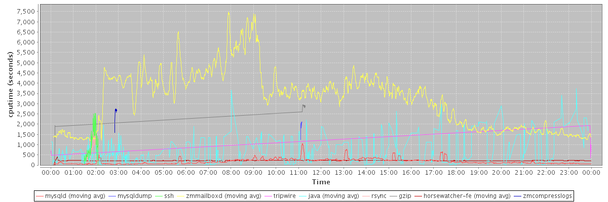 avg(mysqld) = 179.38 avg(mysqldump) = 1923.22 avg(ssh) = 1039.82 avg(zmmailboxd) = 3223.20 avg(tripwire) = 933.00 avg(java) = 607.24 avg(rsync) = 691.07 avg(gzip) = 2540.23 avg(horsewatcher-fe) = 220.77 avg(zmcompresslogs) = 2555.00