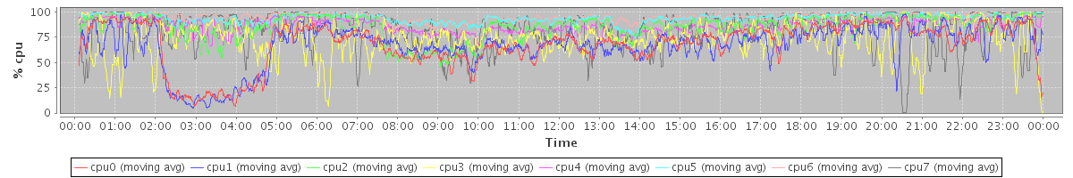 avg(cpu0) = 14.00 avg(cpu1) = 19.29 avg(cpu2) = 10.48 avg(cpu3) = 24.34 avg(cpu4) = 12.36 avg(cpu5) = 4.63 avg(cpu6) = 3.61 avg(cpu7) = 17.19