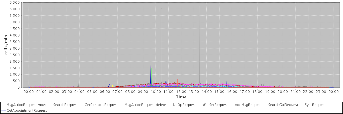 max(MsgActionRequest.move) = 618.00 max(SearchRequest) = 206.00 max(GetContactsRequest) = 1440.00 max(MsgActionRequest.delete) = 635.00 max(NoOpRequest) = 340.00 max(WaitSetRequest) = 208.00 max(AddMsgRequest) = 213.00 max(SearchGalRequest) = 6199.00 max(SyncRequest) = 446.00 max(GetAppointmentRequest) = 1739.00