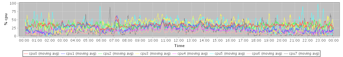 avg(cpu0) = 24.62 avg(cpu1) = 18.38 avg(cpu2) = 2.30 avg(cpu3) = 1.20 avg(cpu4) = 1.87 avg(cpu5) = 0.76 avg(cpu6) = 1.03 avg(cpu7) = 0.50