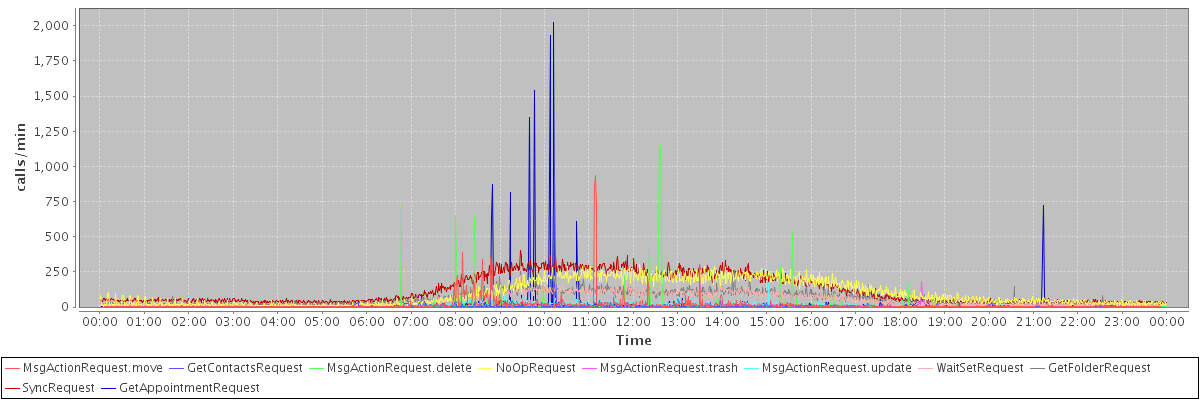 max(MsgActionRequest.move) = 932.00 max(GetContactsRequest) = 934.00 max(MsgActionRequest.delete) = 1147.00 max(NoOpRequest) = 305.00 max(MsgActionRequest.trash) = 181.00 max(MsgActionRequest.update) = 177.00 max(WaitSetRequest) = 226.00 max(GetFolderRequest) = 287.00 max(SyncRequest) = 404.00 max(GetAppointmentRequest) = 2025.00