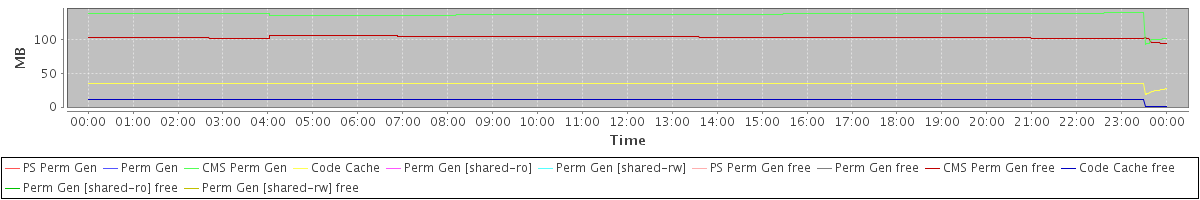 avg(PS Perm Gen) = 0.00 avg(Perm Gen) = 0.00 avg(CMS Perm Gen) = 137.34 avg(Code Cache) = 35.10 avg(Perm Gen [shared-ro]) = 0.00 avg(Perm Gen [shared-rw]) = 0.00 avg(PS Perm Gen free) = 0.00 avg(Perm Gen free) = 0.00 avg(CMS Perm Gen free) = 103.65 avg(Code Cache free) = 11.08 avg(Perm Gen [shared-ro] free) = 0.00 avg(Perm Gen [shared-rw] free) = 0.00