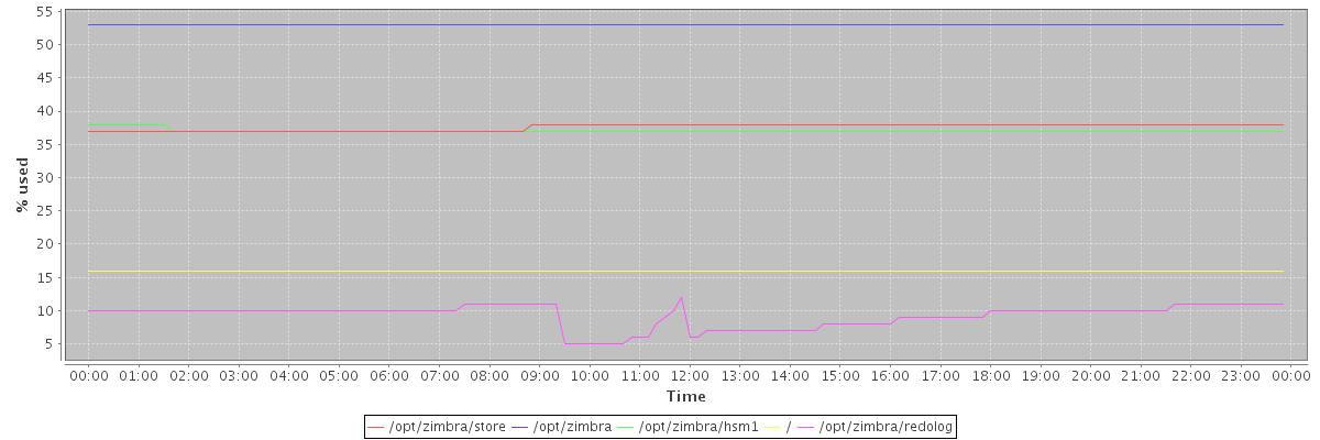 avg(/opt/zimbra/store) = 37.63 avg(/opt/zimbra) = 53.00 avg(/opt/zimbra/hsm1) = 37.07 avg(/) = 16.00 avg(/opt/zimbra/redolog) = 9.26
