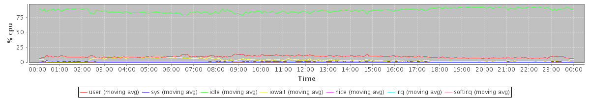 avg(user) = 9.16 avg(sys) = 0.78 avg(idle) = 86.41 avg(iowait) = 3.52 avg(nice) = 0.00 avg(irq) = 0.00 avg(softirq) = 0.13
