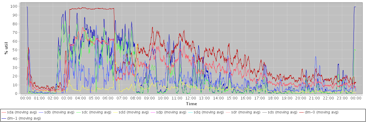 avg(sda) = 26.23 avg(sdb) = 14.86 avg(sdc) = 17.07 avg(sdd) = 5.41 avg(sdp) = 26.22 avg(sdq) = 14.85 avg(sdr) = 17.10 avg(sds) = 5.43 avg(dm-0) = 40.27 avg(dm-1) = 22.49