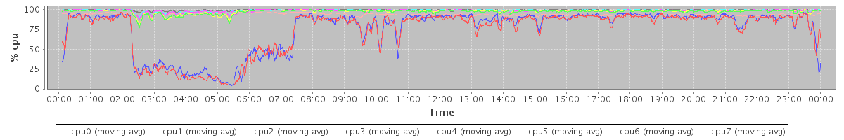 avg(cpu0) = 73.40 avg(cpu1) = 74.84 avg(cpu2) = 97.08 avg(cpu3) = 97.58 avg(cpu4) = 98.46 avg(cpu5) = 98.84 avg(cpu6) = 93.76 avg(cpu7) = 99.38