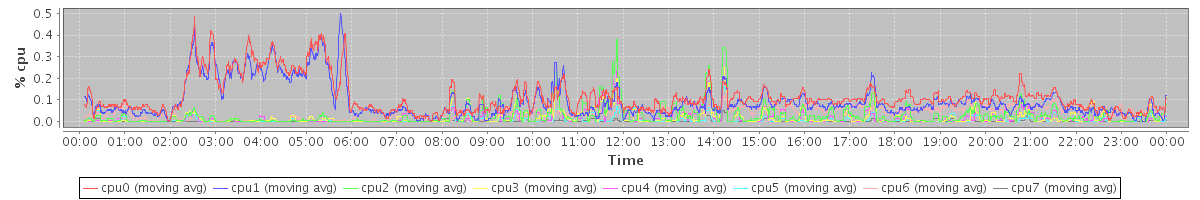 avg(cpu0) = 0.12 avg(cpu1) = 0.10 avg(cpu2) = 0.03 avg(cpu3) = 0.02 avg(cpu4) = 0.02 avg(cpu5) = 0.01 avg(cpu6) = 0.04 avg(cpu7) = 0.00