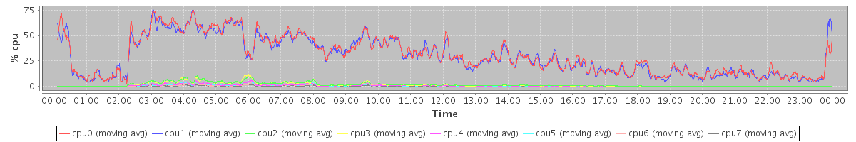 avg(cpu0) = 30.33 avg(cpu1) = 29.48 avg(cpu2) = 1.63 avg(cpu3) = 1.43 avg(cpu4) = 0.68 avg(cpu5) = 0.59 avg(cpu6) = 0.52 avg(cpu7) = 0.22