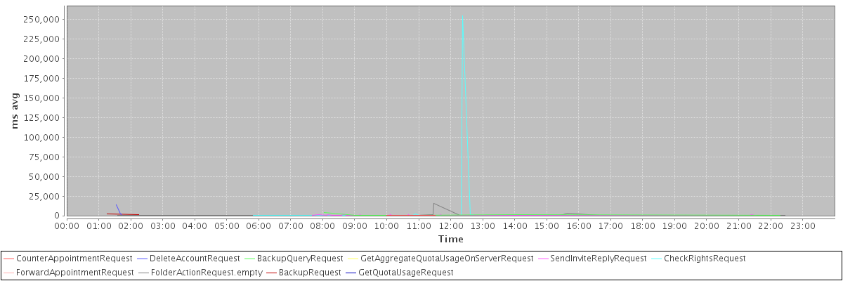 avg(CounterAppointmentRequest) = 510.67 avg(DeleteAccountRequest) = 5746.33 avg(BackupQueryRequest) = 1235.80 avg(GetAggregateQuotaUsageOnServerRequest) = 1257.00 avg(SendInviteReplyRequest) = 325.09 avg(CheckRightsRequest) = 1364.23 avg(ForwardAppointmentRequest) = 354.00 avg(FolderActionRequest.empty) = 1064.88 avg(BackupRequest) = 1613.50 avg(GetQuotaUsageRequest) = 1482.00