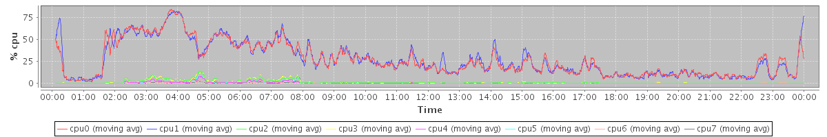 avg(cpu0) = 26.72 avg(cpu1) = 27.21 avg(cpu2) = 1.36 avg(cpu3) = 1.32 avg(cpu4) = 0.59 avg(cpu5) = 0.59 avg(cpu6) = 0.44 avg(cpu7) = 0.24