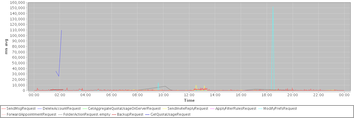 avg(SendMsgRequest) = 465.95 avg(DeleteAccountRequest) = 56993.67 avg(GetAggregateQuotaUsageOnServerRequest) = 1129.00 avg(SendInviteReplyRequest) = 444.16 avg(ApplyFilterRulesRequest) = 9289.00 avg(ModifyPrefsRequest) = 754.14 avg(ForwardAppointmentRequest) = 506.00 avg(FolderActionRequest.empty) = 959.23 avg(BackupRequest) = 1451.50 avg(GetQuotaUsageRequest) = 1294.00