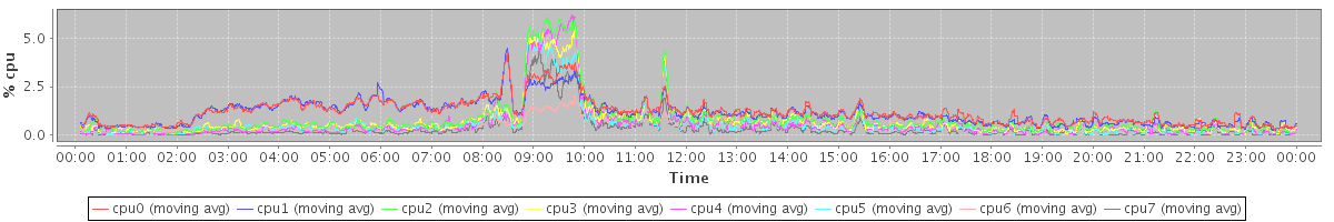 avg(cpu0) = 12.06 avg(cpu1) = 11.18 avg(cpu2) = 4.58 avg(cpu3) = 4.02 avg(cpu4) = 2.88 avg(cpu5) = 2.58 avg(cpu6) = 9.23 avg(cpu7) = 1.80