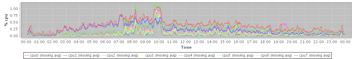 avg(cpu0) = 1.55 avg(cpu1) = 1.13 avg(cpu2) = 1.12 avg(cpu3) = 0.65 avg(cpu4) = 0.95 avg(cpu5) = 0.50 avg(cpu6) = 0.64 avg(cpu7) = 0.31