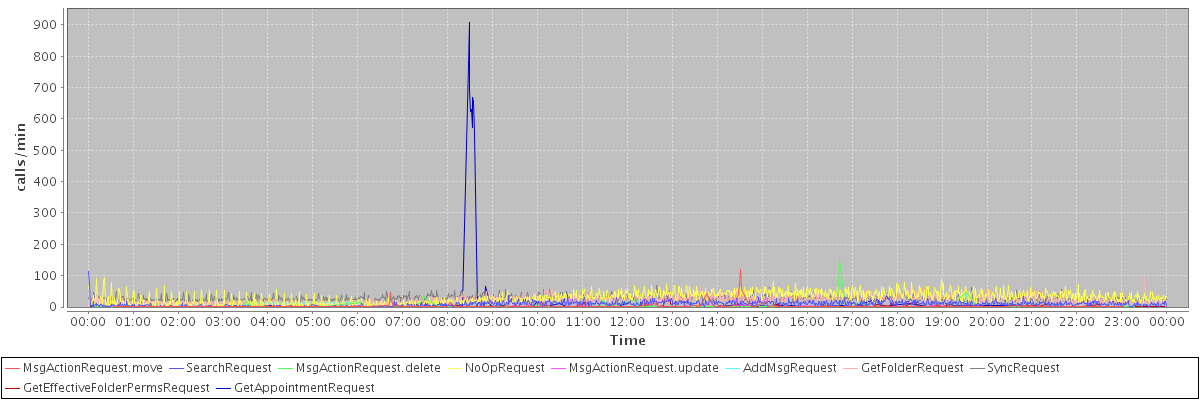 max(MsgActionRequest.move) = 118.00 max(SearchRequest) = 112.00 max(MsgActionRequest.delete) = 150.00 max(NoOpRequest) = 93.00 max(MsgActionRequest.update) = 45.00 max(AddMsgRequest) = 45.00 max(GetFolderRequest) = 94.00 max(SyncRequest) = 68.00 max(GetEffectiveFolderPermsRequest) = 48.00 max(GetAppointmentRequest) = 908.00