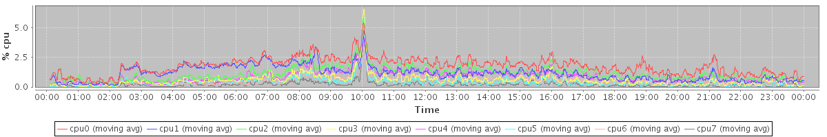 avg(cpu0) = 1.74 avg(cpu1) = 1.13 avg(cpu2) = 1.13 avg(cpu3) = 0.58 avg(cpu4) = 0.88 avg(cpu5) = 0.42 avg(cpu6) = 0.54 avg(cpu7) = 0.23