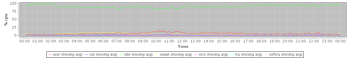 avg(user) = 5.41 avg(sys) = 0.66 avg(idle) = 90.73 avg(iowait) = 3.08 avg(nice) = 0.00 avg(irq) = 0.00 avg(softirq) = 0.11