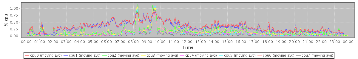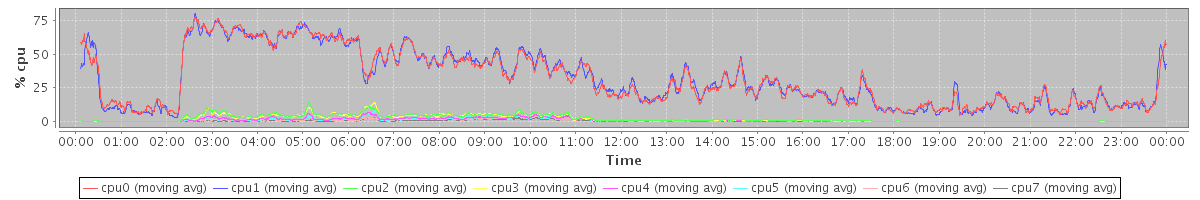 avg(cpu0) = 1.56 avg(cpu1) = 1.48 avg(cpu2) = 1.00 avg(cpu3) = 0.92 avg(cpu4) = 0.78 avg(cpu5) = 0.68 avg(cpu6) = 0.62 avg(cpu7) = 0.46