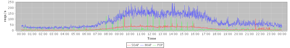 Host zm04.stanford.edu: Mailboxd: Request Rate by Client Protocol
