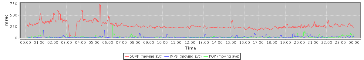 avg(DeleteAccountRequest) = 63986.57 avg(BackupQueryRequest) = 499.50 avg(GetAggregateQuotaUsageOnServerRequest) = 3792.00 avg(SendInviteReplyRequest) = 422.91 avg(ForwardAppointmentRequest) = 638.00 avg(FolderActionRequest.empty) = 704.93 avg(GetConvRequest) = 875.00 avg(SyncGalAccountRequest) = 99259.04 avg(BackupRequest) = 2878.50 avg(GetQuotaUsageRequest) = 5500.00
