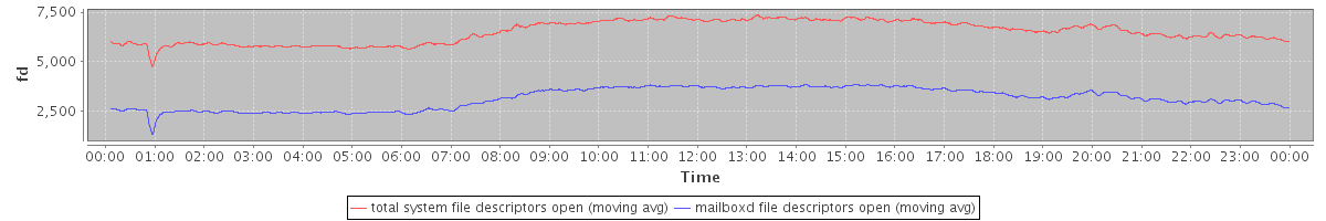 avg(total system file descriptors open) = 6501.16 avg(mailboxd file descriptors open) = 3128.68