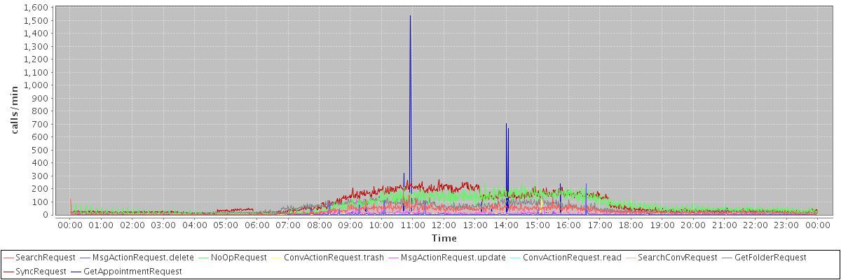 max(SearchRequest) = 155.00 max(MsgActionRequest.delete) = 239.00 max(NoOpRequest) = 240.00 max(ConvActionRequest.trash) = 177.00 max(MsgActionRequest.update) = 124.00 max(ConvActionRequest.read) = 155.00 max(SearchConvRequest) = 191.00 max(GetFolderRequest) = 162.00 max(SyncRequest) = 273.00 max(GetAppointmentRequest) = 1539.00