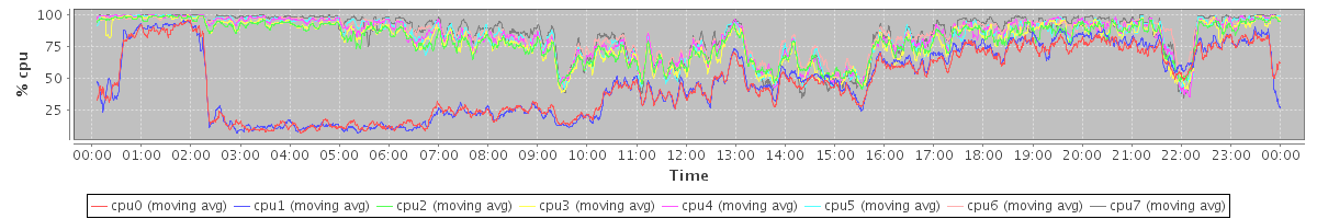 avg(cpu0) = 23.93 avg(cpu1) = 22.74 avg(cpu2) = 17.14 avg(cpu3) = 17.83 avg(cpu4) = 15.75 avg(cpu5) = 16.02 avg(cpu6) = 13.49 avg(cpu7) = 14.32