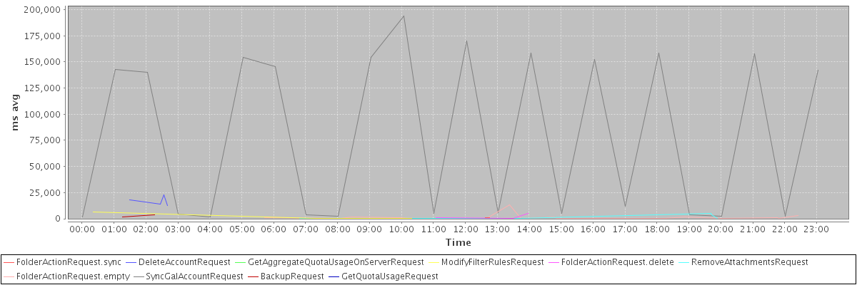 avg(FolderActionRequest.sync) = 850.33 avg(DeleteAccountRequest) = 16908.50 avg(GetAggregateQuotaUsageOnServerRequest) = 1198.00 avg(ModifyFilterRulesRequest) = 1187.17 avg(FolderActionRequest.delete) = 1921.33 avg(RemoveAttachmentsRequest) = 832.25 avg(FolderActionRequest.empty) = 1120.72 avg(SyncGalAccountRequest) = 80113.92 avg(BackupRequest) = 2835.50 avg(GetQuotaUsageRequest) = 1344.00
