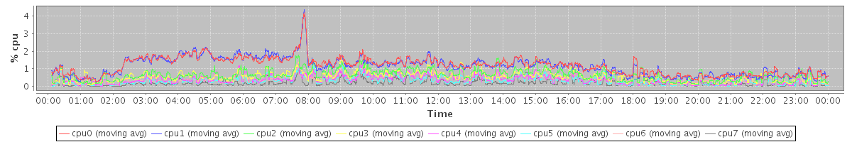 avg(cpu0) = 1.17 avg(cpu1) = 1.14 avg(cpu2) = 0.64 avg(cpu3) = 0.55 avg(cpu4) = 0.40 avg(cpu5) = 0.33 avg(cpu6) = 0.44 avg(cpu7) = 0.21