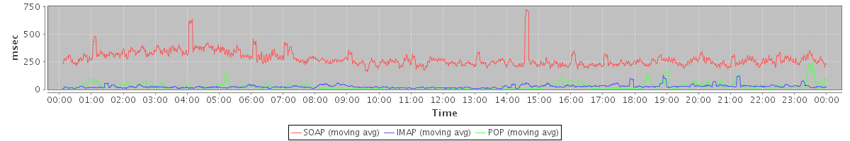 avg(SendMsgRequest) = 379.61 avg(BackupQueryRequest) = 437.17 avg(GetAggregateQuotaUsageOnServerRequest) = 1352.00 avg(SendInviteReplyRequest) = 351.91 avg(MsgActionRequest.!read) = 400.47 avg(ForwardAppointmentRequest) = 323.00 avg(FolderActionRequest.empty) = 784.21 avg(SyncGalAccountRequest) = 60760.13 avg(BackupRequest) = 2607.00 avg(GetQuotaUsageRequest) = 1517.00