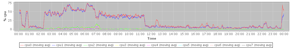 avg(cpu0) = 1.19 avg(cpu1) = 1.13 avg(cpu2) = 0.51 avg(cpu3) = 0.50 avg(cpu4) = 0.35 avg(cpu5) = 0.33 avg(cpu6) = 0.36 avg(cpu7) = 0.20