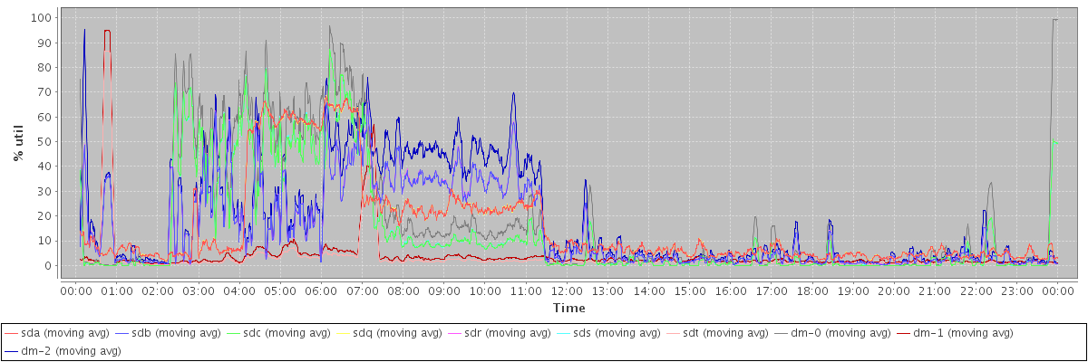 avg(sda) = 15.45 avg(sdb) = 14.35 avg(sdc) = 13.77 avg(sdq) = 15.45 avg(sdr) = 14.36 avg(sds) = 13.79 avg(sdt) = 3.08 avg(dm-0) = 17.94 avg(dm-1) = 4.12 avg(dm-2) = 18.22